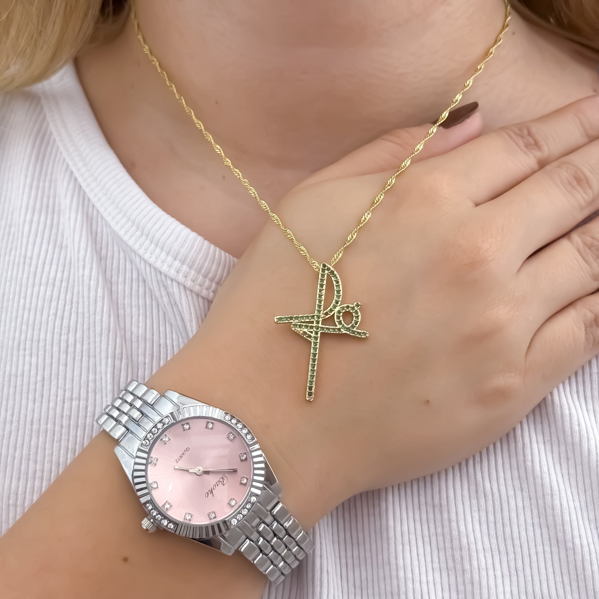 Cadena Singapur de Dama de 45cm de 3mm de Grosor + Dije de Fe con Micro circones verde en Oro Laminado 18k con Garantia de por vida + Reloj de Alta Gama con Garantia