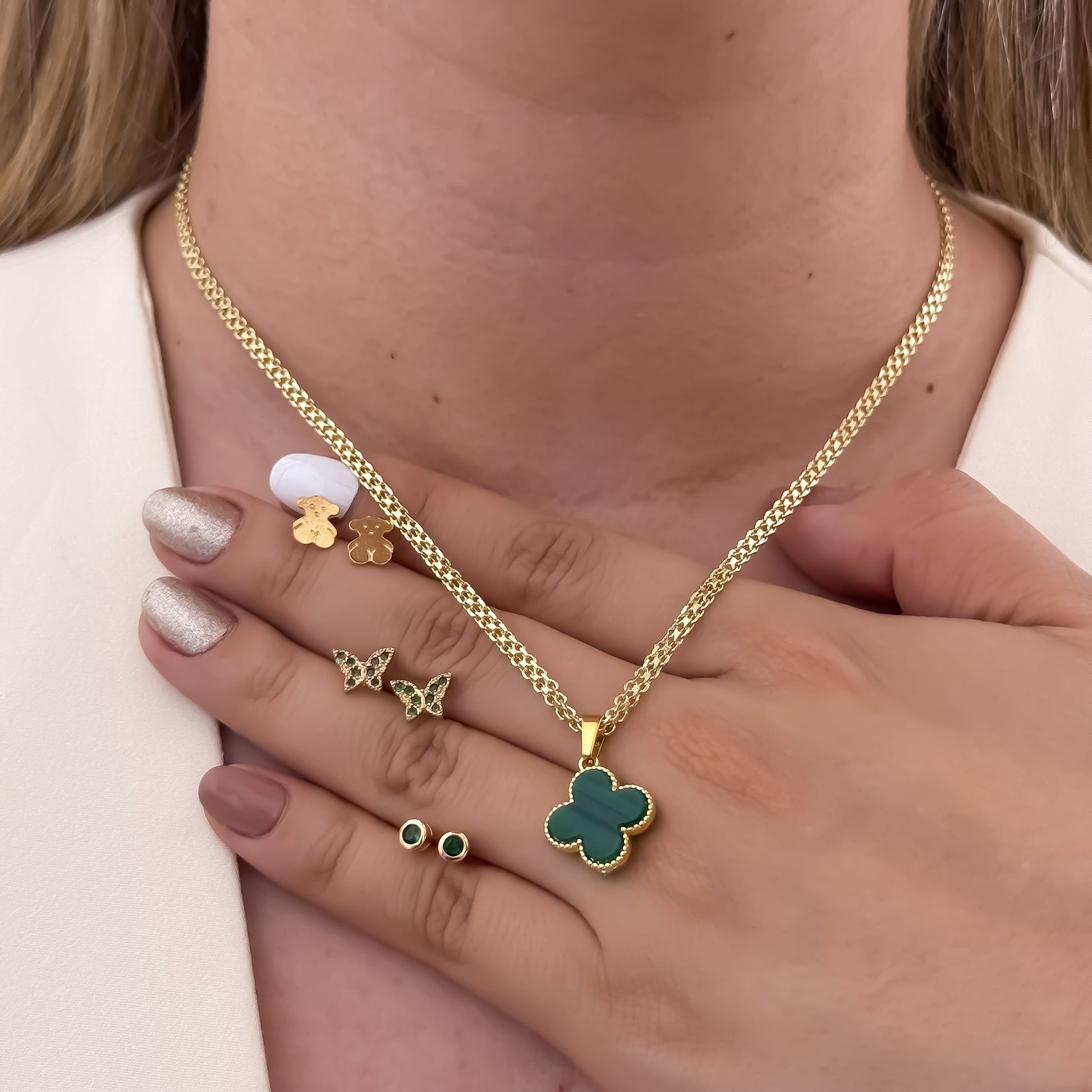 El trébol verde representa la suerte y la esperanza, mientras que cada topo (oso, mariposa y piedra verde) añade un toque de ternura, libertad y elegancia a tu look diario. Luce moderna, femenina y protegida con un conjunto que resalta tu personalidad en cualquier ocasión 🌟