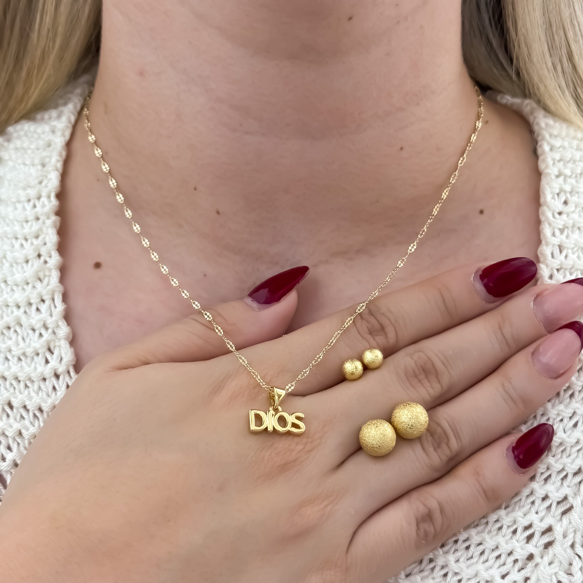 Conjunto Exclusivo en Oro Laminado 18k Cadena tejido Crispeta 45cm + Dije de Dios Protección + Aretes Diamantados en Balín 8mm y 6mm Diamantado