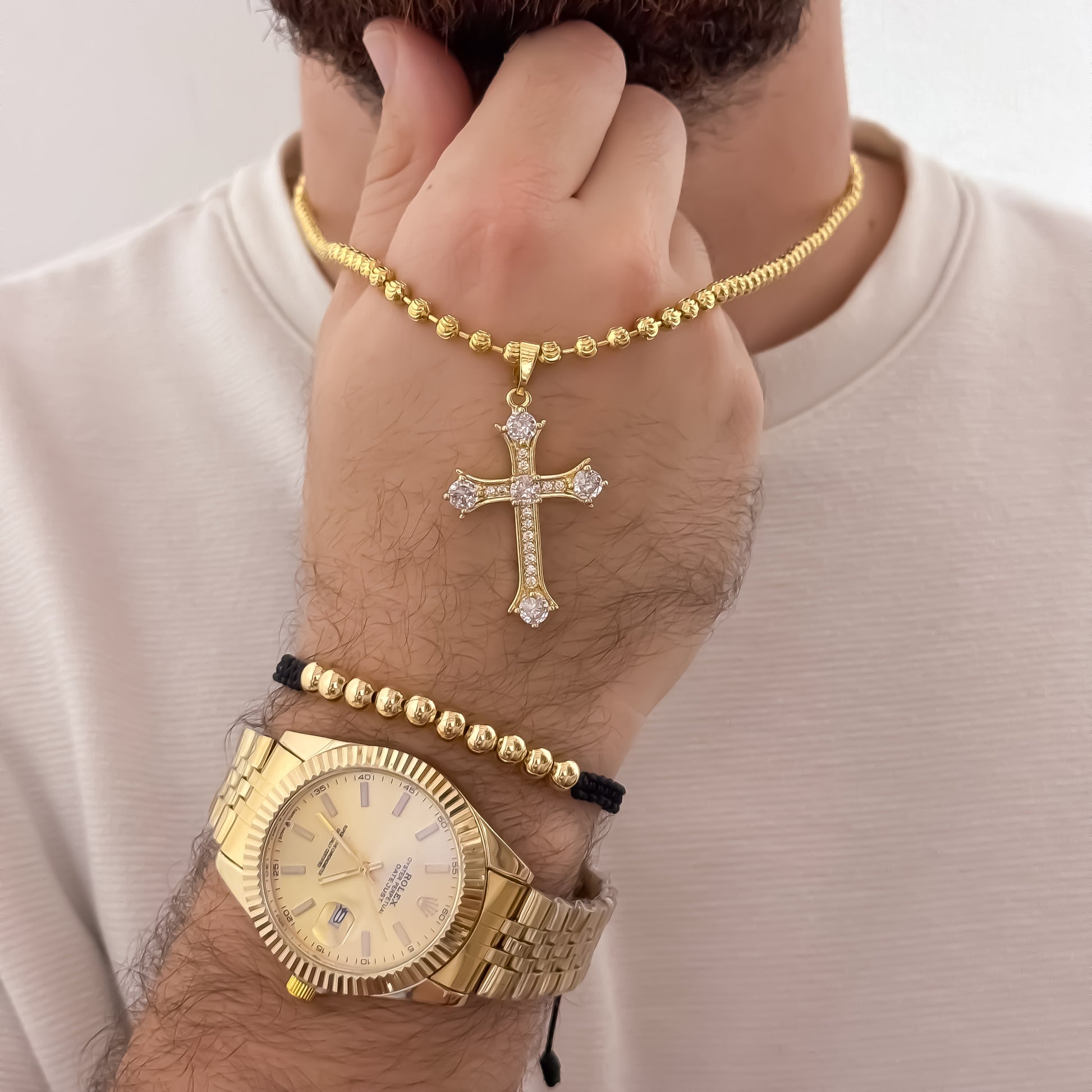 La cruz con circones simboliza fe y seguridad espiritual. Vestir con un reloj tipo Rolex, cadena militar y pulsera balín te da presencia, autoridad y estilo en cualquier lugar. Sentirte seguro de ti mismo, vestir con elegancia y mostrar que sabes elegir calidad a un precio justo.
