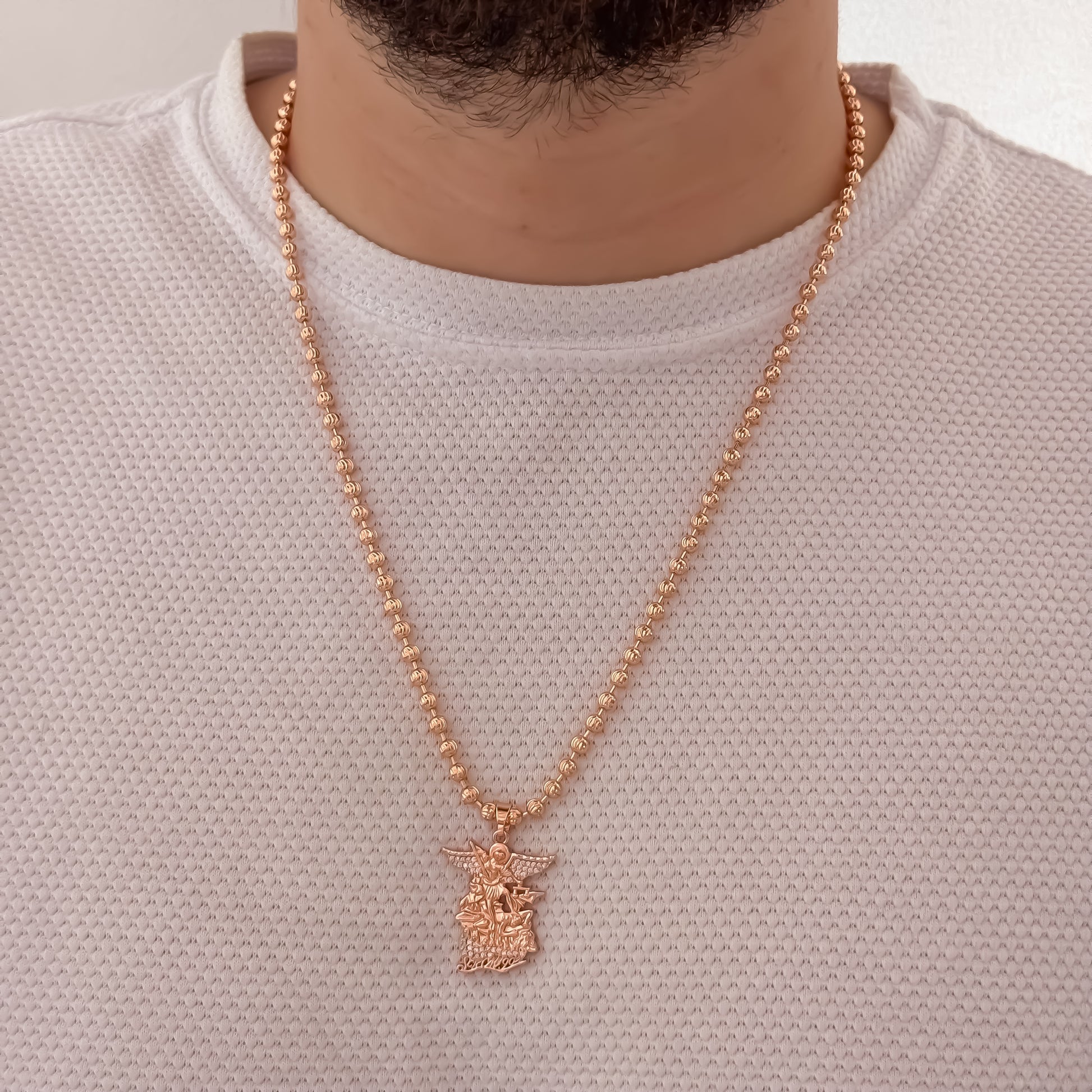 Luce con orgullo esta cadena de San Miguel Arcángel en oro rosa 18K laminado y lleva contigo estilo, protección y distinción todos los días.
