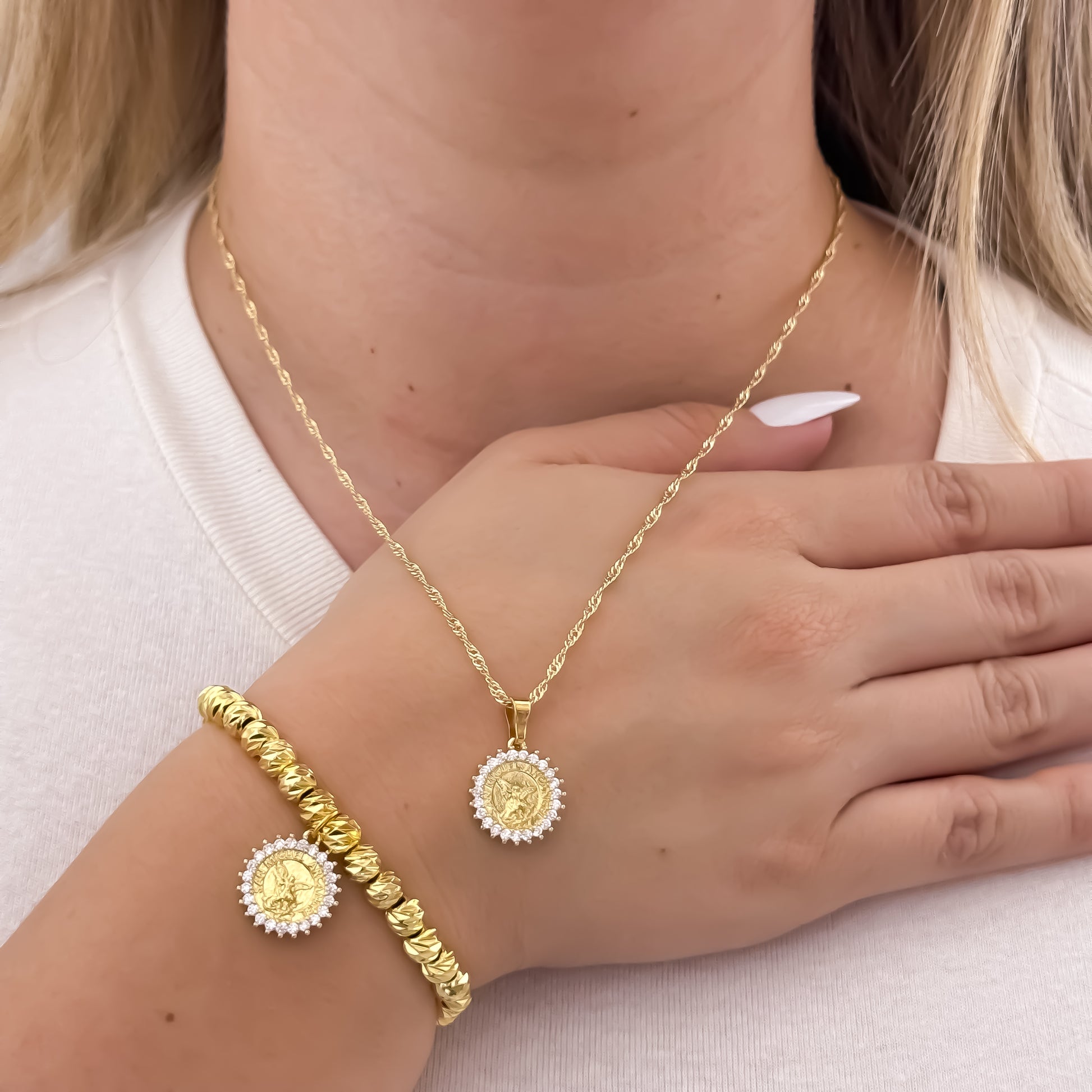 Llevar este conjunto no es solo una decisión de moda, es una elección de fe y energía positiva: San Miguel Arcángel: Defiende tu camino y te protege de todo mal. San Benito: Amuleto de protección y guía espiritual, perfecto para atraer luz y abundancia. Ideal para mujeres que desean lucir elegantes mientras sienten seguridad y tranquilidad.