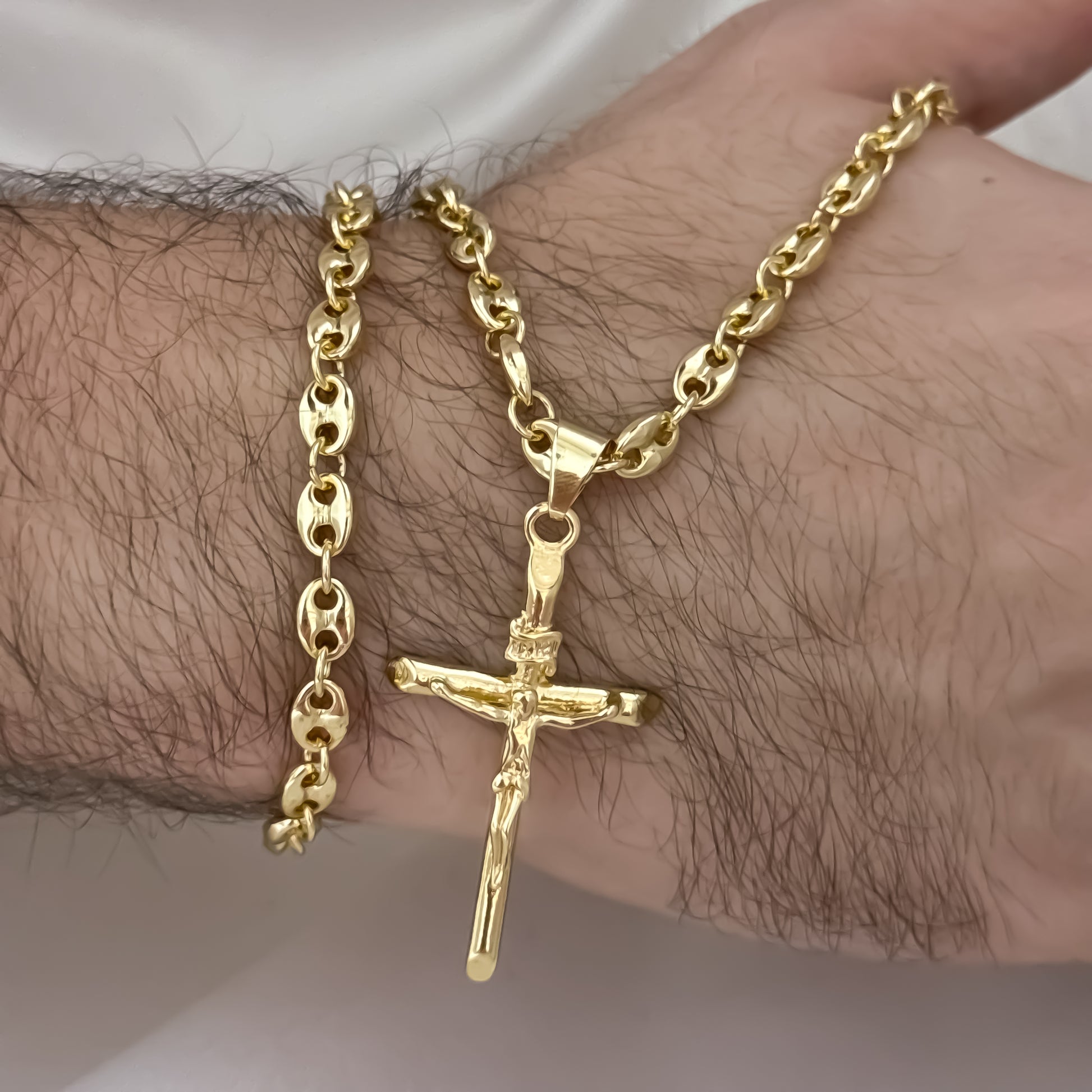 Conjunto de Cadena Tejido Gucci de Hombre de 60cm de 5mm + Cruz Cristo Madero Protección de 3cm + Pulsera Tejido Gucci de 20cm de 5mm en Oro Laminado 18k con Garantía de por vida
