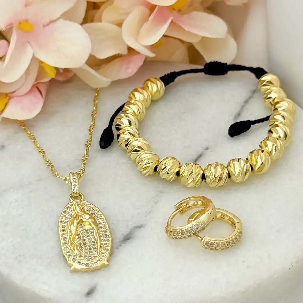 Conjunto para Dama Cadena Tejido Crispeta + Virgen Guadalupe + Candongas Circones Cristales + Pulseras Balin Italiano 6mm en Baño de Oro de 18k con Garantia de por vida