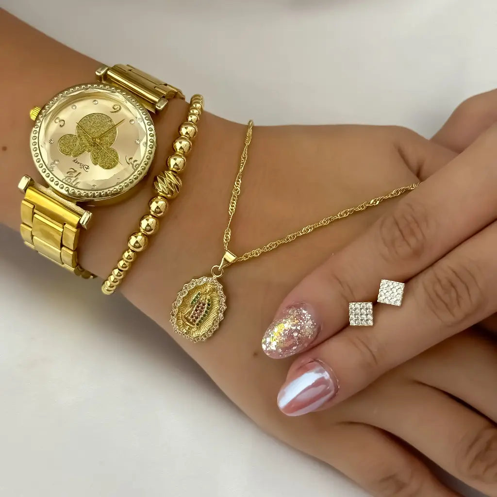 Juego Cadena Tejido Singapur 45cm + Virgen Guadalupe + Topo Cuadrado con micro Circones + Pulsera Balin 4mm Full en Oro Laminado 18k con Garantia de por vida + Reloj Oso Tous con Garantia