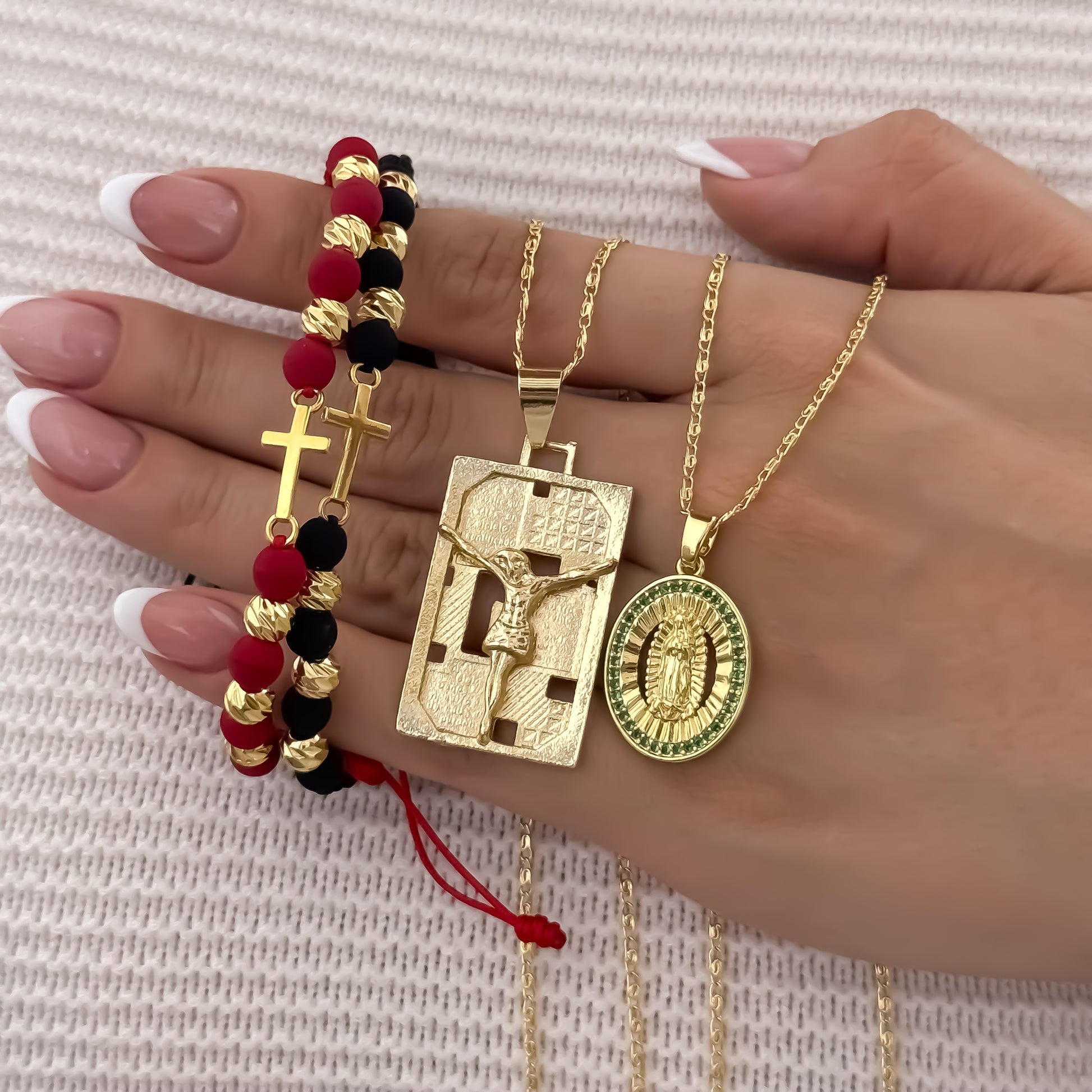 Material premium: Oro laminado 18K con 8 capas reales de baño de oro suizo. Incluye: Cadena dama de 45 cm con dije de CRUZ CRISTO PLACA con micro circones. Cadena caballero de 60 cm con dije de la Virgen del GUADALUPE con incrustaciones de micro circones .Dos pulseras ajustables en balín italiano de 6 mm combinadas con esferas de neopreno mate, un acabado moderno y elegante. Diseño unisex y versátil, ideal para uso diario o eventos especiales.